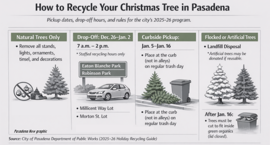 Pasadena’s Department of Public Works has launched its 2025–26 Christmas tree recycling program, offering curbside pickup for city refuse customers and two drop-off sites for all residents, with officials stressing strict rules on what can and cannot be recycl... More »