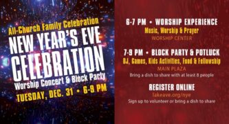 The evening will begin with a gathered time of music, worship, and prayer in the Worship Center for spiritual reflection, followed by fellowship, food, and festivities on the plaza. The celebration includes a potluck competition judged by staff and volunteers, leading up to a simulcast of the New Year’s Eve ball drop in Times Square, New York.