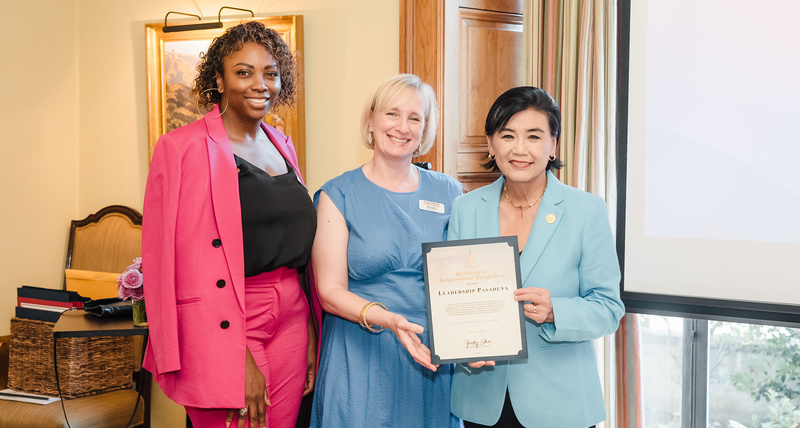 Amara Ononiwu and Mary Spellman of Leadership Pasadena accept a certificate of appreciation from U.S. House Representative Judy Chu.