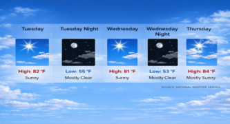 Forecasters said Tuesday’s high will reach 82 degrees under clear skies, with calm winds shifting to light south-southwest breezes in the afternoon. Overnight lows will fall to 55 degrees.