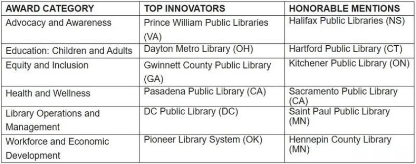 “The Innovations Initiative highlights the best of what libraries across North America offer their communities,” said Brooks Rainwater, President and CEO of the Urban Libraries Council. “In a year that has proved especially challenging for libraries, this year’s winners, honorable mentions, and nominees all demonstrate our urban libraries are as important, resilient, and forward-thinking as ever.”