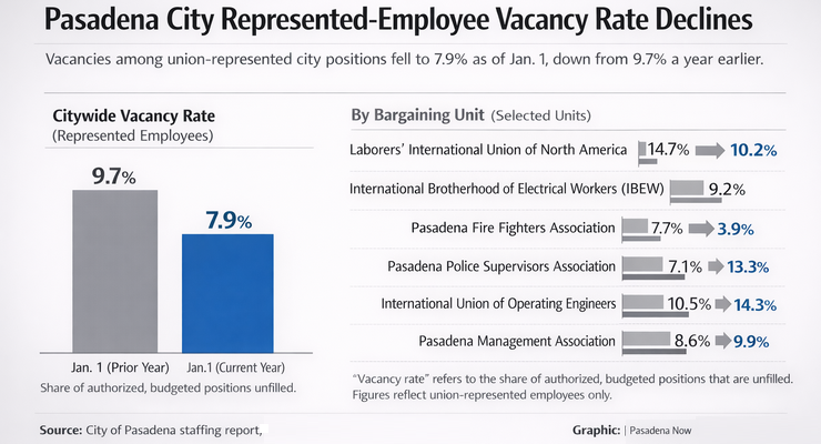 Pasadena’s 7.9% vacancy rate among represented employees means that out of every 100 budgeted, union-represented positions the city has budgeted, a little under eight are empty. Each bargaining unit’s vacancy rate is the percentage of positions in that specific group that do not have someone in the job.