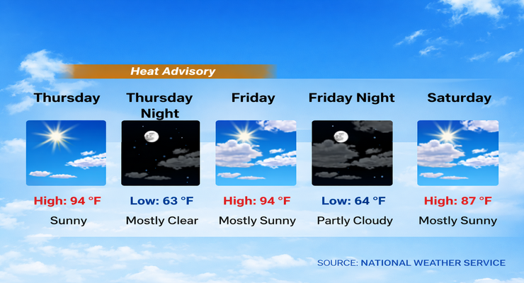 Friday will remain hot, with highs again near 94 degrees. Slight onshore winds may bring minimal cooling, but forecasters said it will not ease the heat threat. Saturday will see modest relief, with highs around 87 degrees.