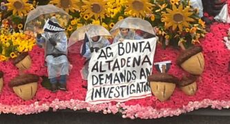 Pasadena Now reporter Eddie Rivera saw a person wearing a raincoat approach and pull the banner from one of the float riders, who clutched it briefly, then let go. Then man who had pulled it away then crumpled up the sign and tossed it back onto the float, as it continued along the parade route.