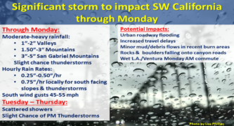 A “potent” and “powerful late-season winter-like storm” will generate moderate to heavy rain across the Southland Monday.