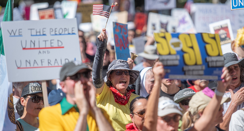 Indivisible SGV’s Patrick Briggs, a local activist and emcee for the rally, opened by inviting attendees to look at one another and ask, “Why are you here today?” He answered his own question: “Because we love one another. We love our neighbors as ourselves. We are about community—and this is how Americans behave when they’re being good citizens.”