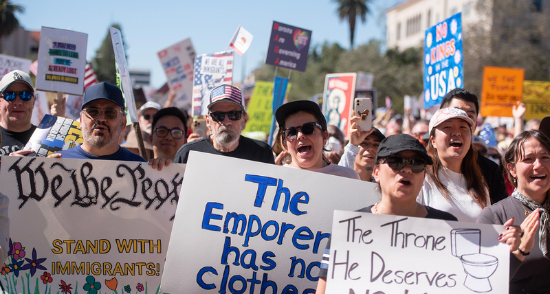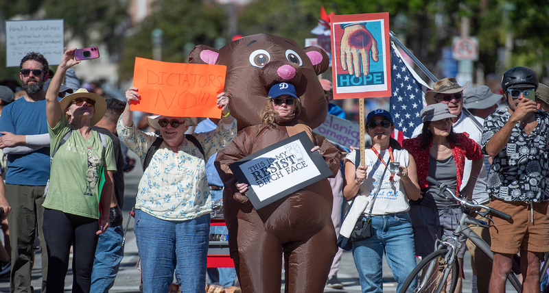 The event, organized by Indivisible San Gabriel Valley, drew a diverse crowd—families with strollers, retirees in sunhats, and students waving homemade placards that read “No King but the People” and “Democracy Is Not a Spectator Sport,” along with a good-sized number of “F— Trump” signs.