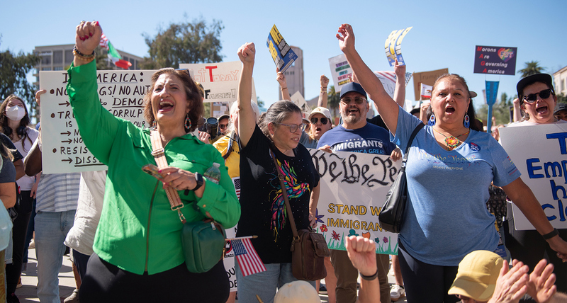State Senator Sasha Renée Pérez framed the protest as a defense of democracy against an “unprecedented transfer of wealth” and efforts to “rig this election.”