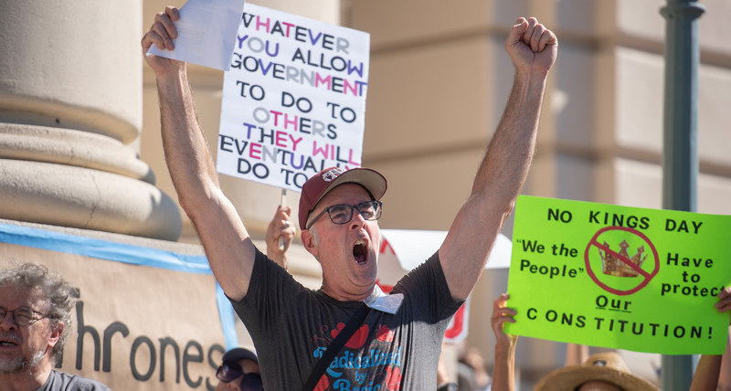 Beneath a clear and hot October sky, several thousand people gathered Saturday on the steps of Pasadena City Hall for “No Kings Day,” one of more than 2,500 similar demonstrations across the United States to protest what organizers called a slide toward authoritarian rule.