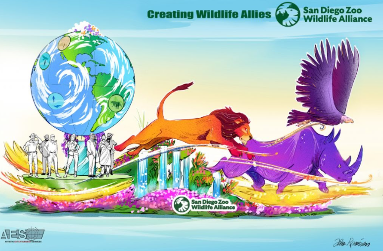 San Diego Zoo Wildlife Alliance is an international conservation organization committed to making connections between people and wildlife every day at the San Diego Zoo and Safari Park. The theme, “Creating Wildlife Allies,” celebrates their dedication to wildlife in eight conservation hubs on six continents. Their veterinarians, nutritionists, researchers and wildlife care specialists work not only at the Zoo and Park, but also alongside over 200 partners around the world. The float proudly represents their history and passion for conservation by highlighting the Lion, Rhino and Condor. By working with partners around the world, San Diego Zoo Wildlife Alliance is creating greater outcomes for wildlife for the next generation and beyond. (Artistic Entertainment Services)
