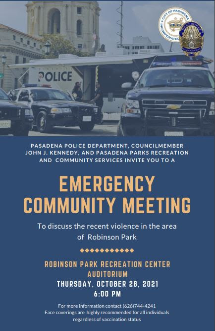 Police officials and Pasadena City Councilman John Kennedy were planning an emergency community meeting at 6 p.m. Thursday at Robinson Park to discuss the recent violence.