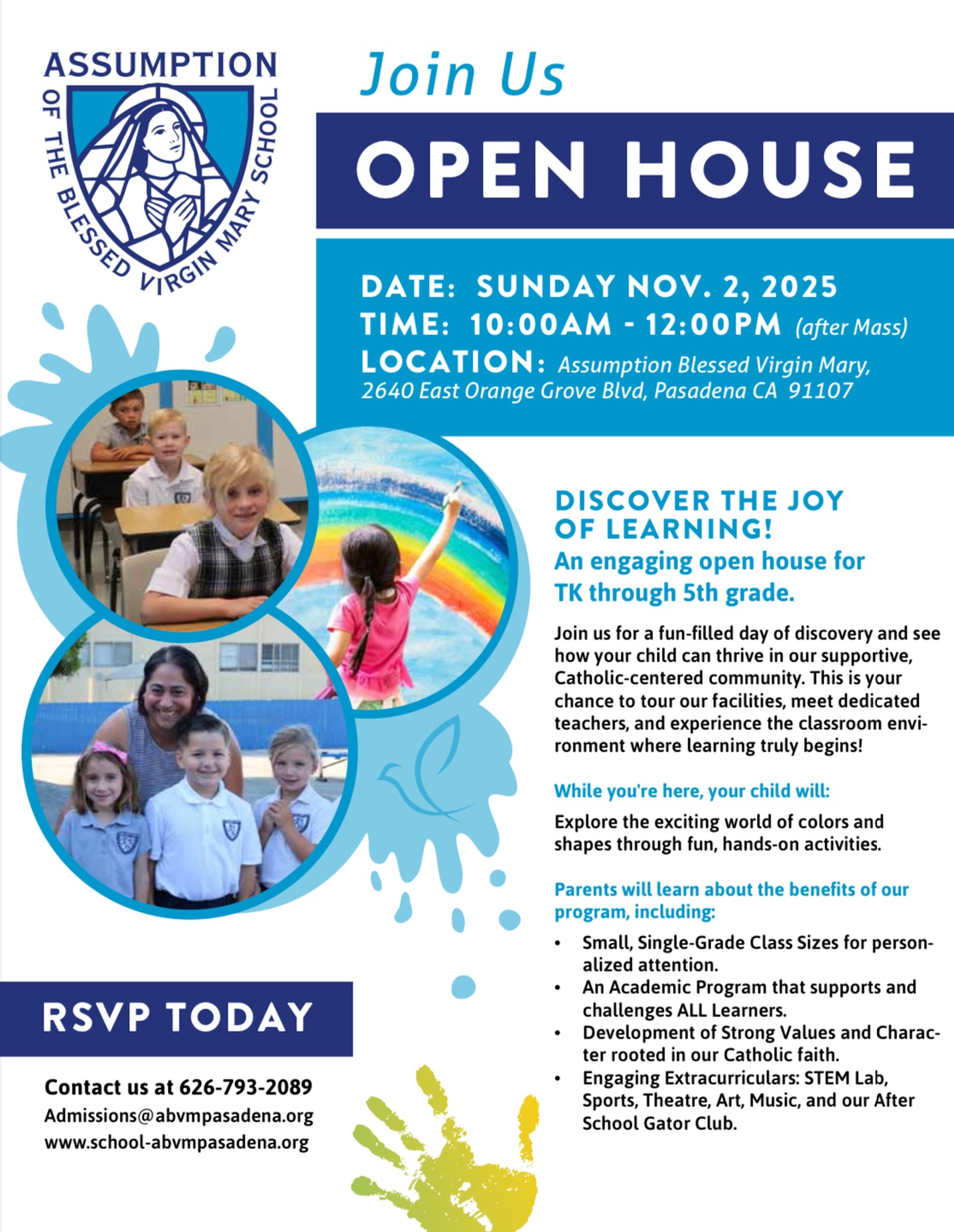 Discover the Joy of Learning! An engaging Open House for TK through 5th grade on Sunday, November 2, 10:00 a.m. to 12:00 p.m. “Join us for a fun-filled day of discovery and see how your child can thrive in our supportive, Catholic-centered community!” This is your chance to tour Assumption of the Blessed Virgin Mary facilities, meet dedicated teachers, and experience the classroom environment where learning truly begins!