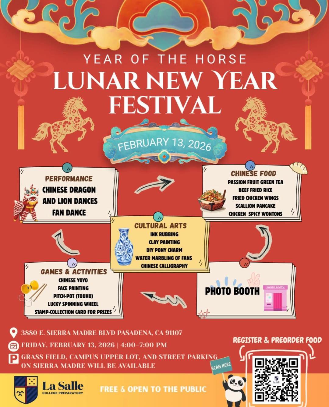 La Salle College Preparatory’s Lunar New Year Night Market takes place Friday, February 13, 2026, from 4 p.m. to 7 p.m. Admission is free and the event is open to the public. The night market will be held on the grass field at La Salle College Preparatory, 3880 E. Sierra Madre Blvd., Pasadena, CA 91107. Parking is available in the campus upper lot and along Sierra Madre Boulevard at no charge. For more information, call 626-351-8951 or visit lasallehs.org.