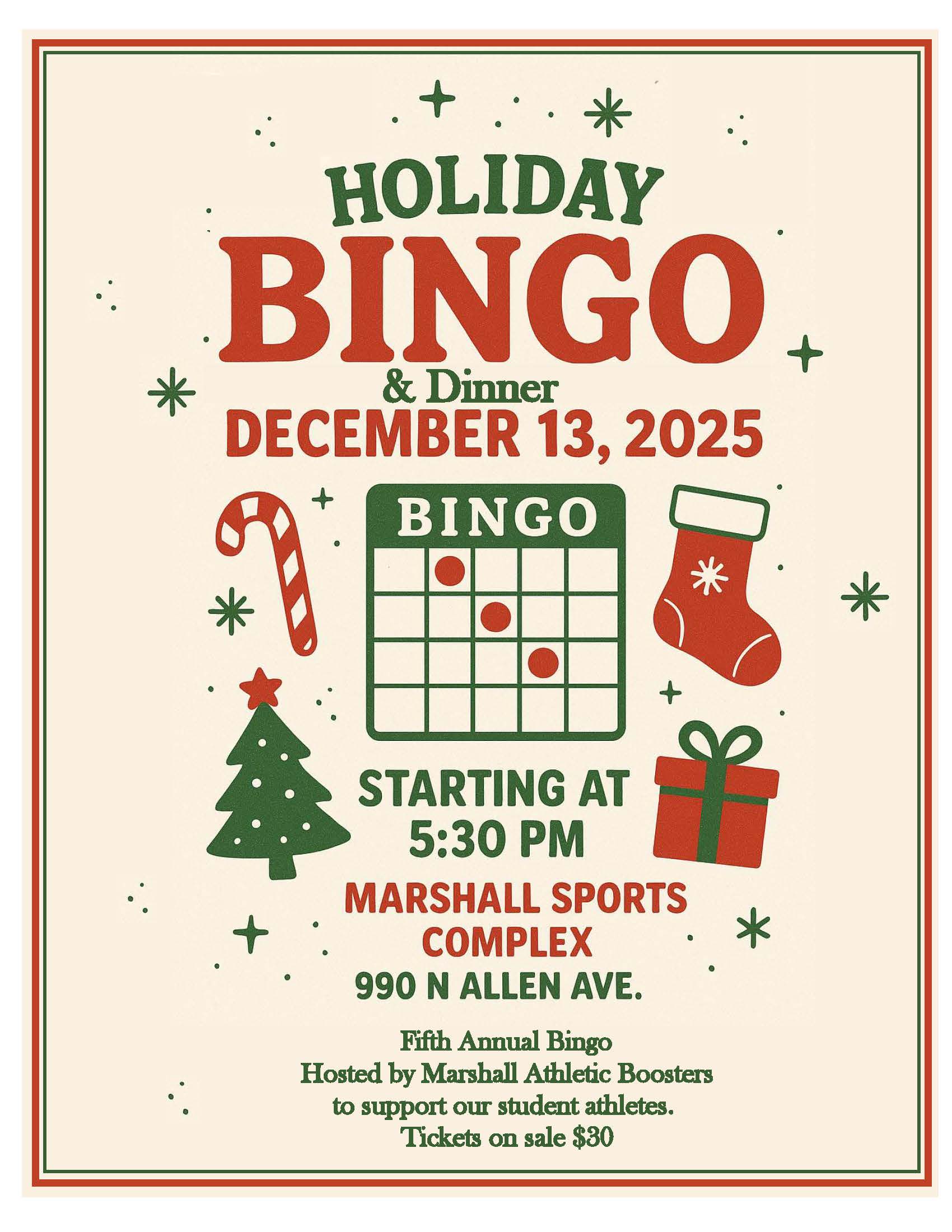 The Marshall Athletic Boosters invite the community to enjoy a festive evening at their Fifth Annual Bingo & Dinner Night—an event filled with holiday cheer, delicious food, and plenty of fun, all in support of Marshall’s student athletes.