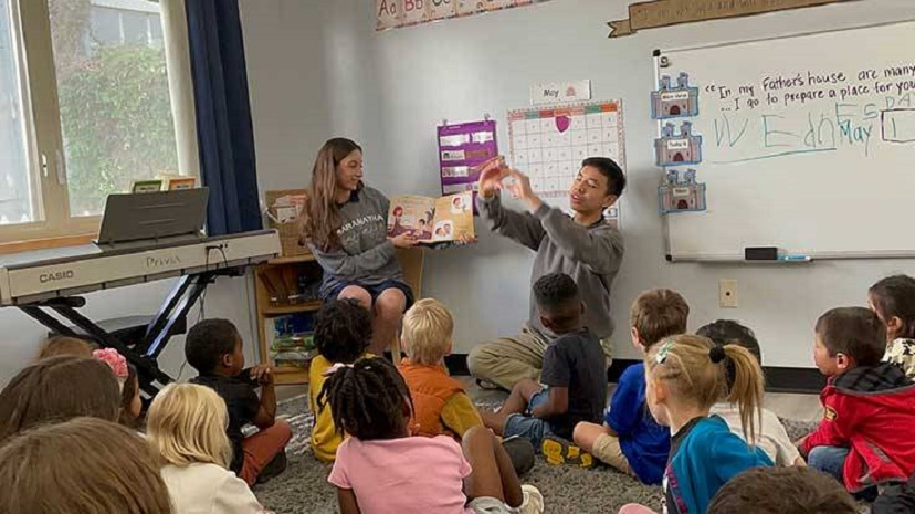 They have been working on their final unit of the year, “Story Telling.” ASL storytelling involves role shifting, using non-manual markers such as facial expressions, correct ASL grammar, and other skills. Maranatha’s ASL 3 students told stories to groups of children, using both a reader and a signer. The high schoolers did great, and the PCS students loved having big kids on campus.