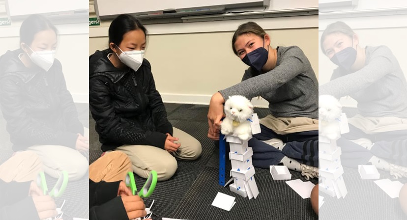 Just before winter break, students in Middle School Math Teacher Jamie Linton’s 7th grade class accepted the challenge of using the 8-step engineering design process in 20 minutes to (hypothetically) save a cat in danger of being eaten by a fierce crocodile! Students had to build a tower that was 12 inches off the ground using only index cards and no more than 12 inches of tape to save the cat.